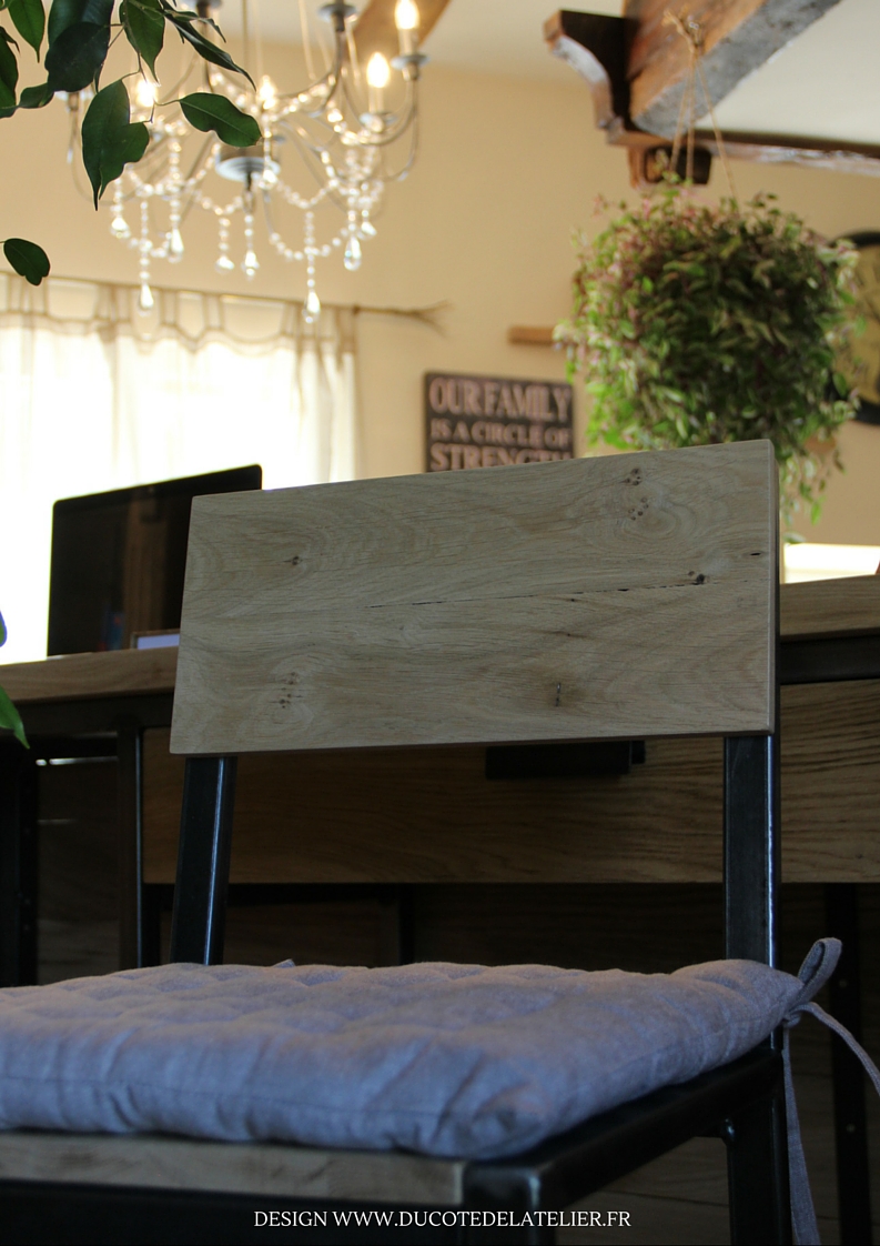 Cette chaise semi haute en chêne et acier (patiné) sera très joie présentée derrière un comptoir pour un magasin, un bureau, autour d’un bar…