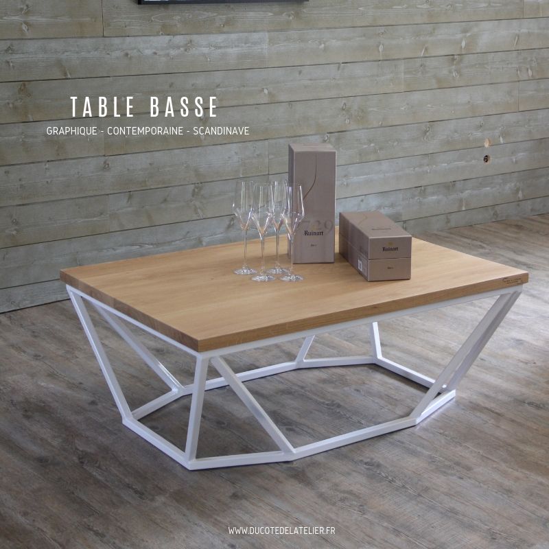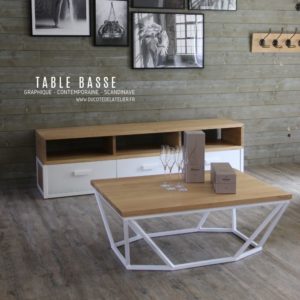 Cette table basse en chêne a un design très graphique, aérien et épuré. Un esprit scandinave grâce au coloris blanc du piétement.